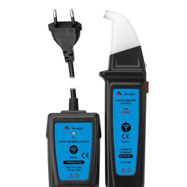 Encontre rapidamente o disjuntor correto no quadro de energia com o Minipa EzFind I, um localizador profissional composto por transmissor e receptor, ideal para eletricistas, instaladores, manutenção predial e uso residencial. O transmissor é conectado a uma tomada do circuito que deseja identificar. O receptor é utilizado no quadro de energia para detectar o sinal enviado e localizar exatamente qual disjuntor alimenta aquela tomada.